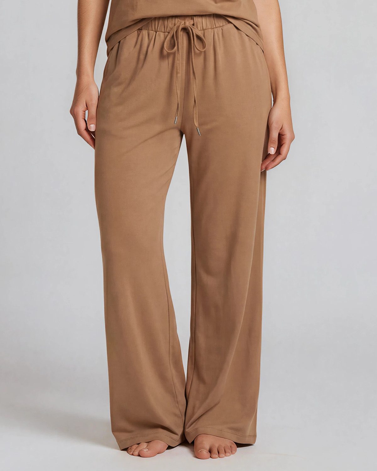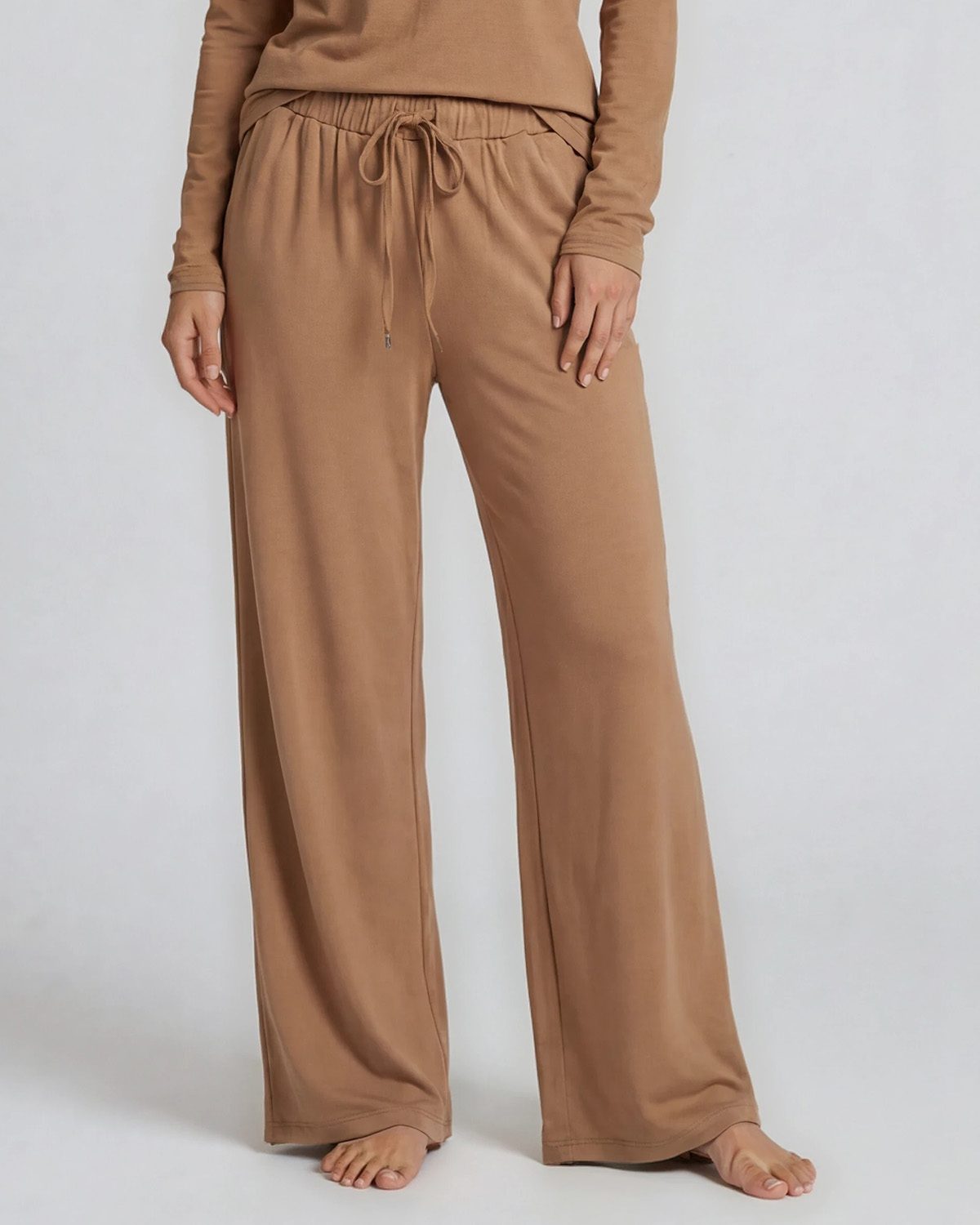 Ett par härligt långa byxor i luftig, jersey med lös passform. Byxorna har hög midja, resår I MIDJAN och dragsko. Dolda sidfickor och vida ben.