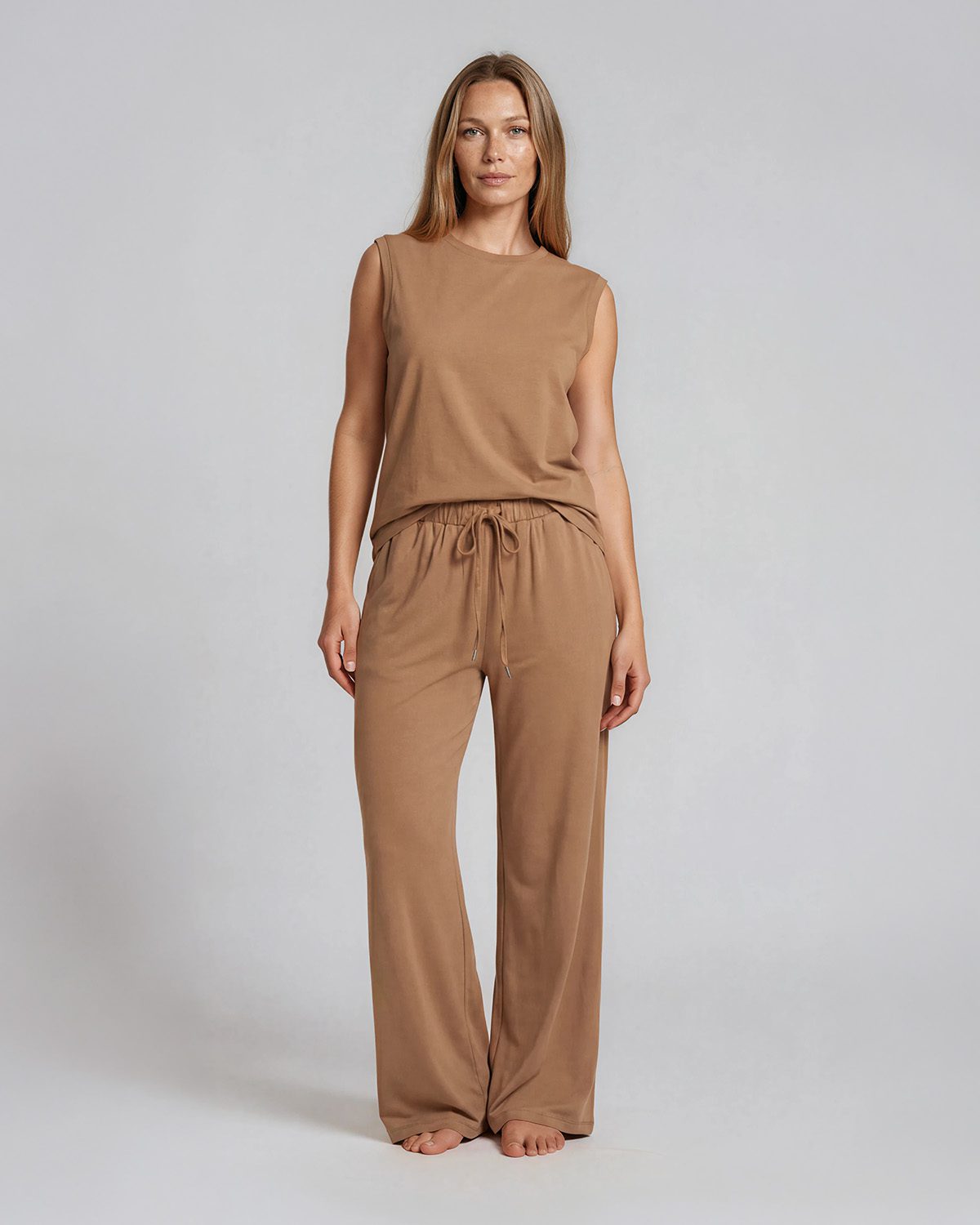 Tillverkade i ett lyxigt mjuk och följsam blandning av bomull, modal och elastan, ger de dig ett plagg som andas, håller formen och känns behagligt mot huden hela dagen. Materialet är lätt, svalt och rör sig med din kropp – perfekt för både yoga, meditation, lounging eller en enkel vardagslook.